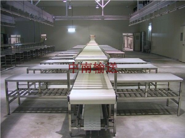 分割輸送機(jī)又稱(chēng)不銹鋼尼龍輸送線,是分割肉流水線生產(chǎn)的主要設(shè)備之一。適用于牲畜胴體劈半、預(yù)冷、排酸后的剔骨、分割,該機(jī)的機(jī)架體全部采用不銹鋼材料。輸送帶為無(wú)毒尼龍輸送帶,為使經(jīng)久耐用,采用了無(wú)接頭的特制方式,使該機(jī)在使用中達(dá)到了無(wú)噪音,輸送帶無(wú)偏斜現(xiàn)象發(fā)生,機(jī)腳座采用尼龍活動(dòng)腳,安裝調(diào)式輸簡(jiǎn)便,機(jī)架選料為無(wú)縫不銹鋼方管,解決發(fā)積垢污染問(wèn)題。使設(shè)備的衛(wèi)生條件達(dá)到了分割車(chē)間對(duì)外注冊(cè)的標(biāo)準(zhǔn),并使剔骨、分割肉生產(chǎn)輸送自動(dòng)化。